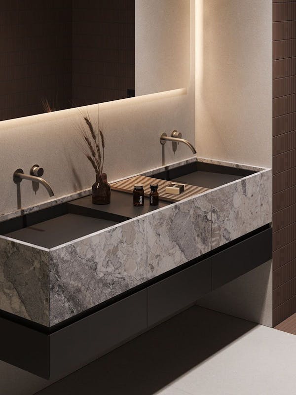 Encimeras y lavabos para el baño. Paneles retroiluminados. Platos de ducha. Botones de instalación integrados.